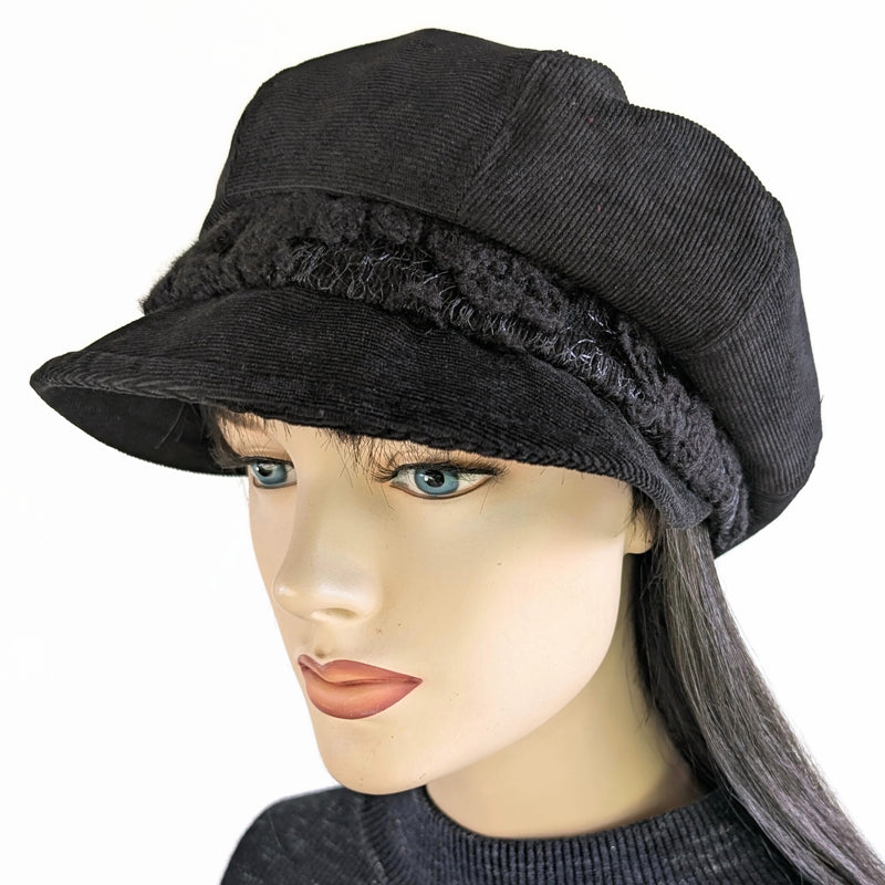 $65.00 CADBaggy Newsboy Fashion Cap in black with black wooly lace trim, relaxed fit