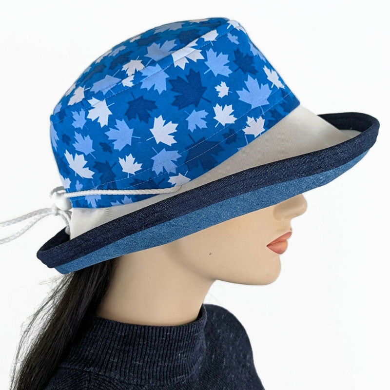 Canada Sunblocker UV summer sun hat with wide brim, Canada blue and white maple leaves, adjustable fit