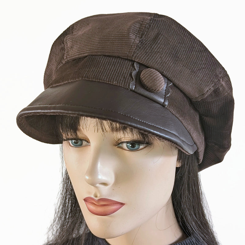 $65.00 CADBaggy Newsboy Fashion Cap in chocolate brown with matching vegan leather trim, relaxed fit