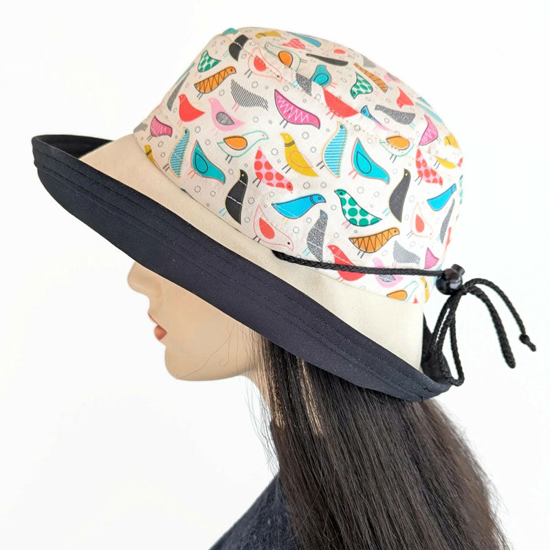 Sunblocker UV summer sun hat with wide brim, artsy birds print, adjustable fit