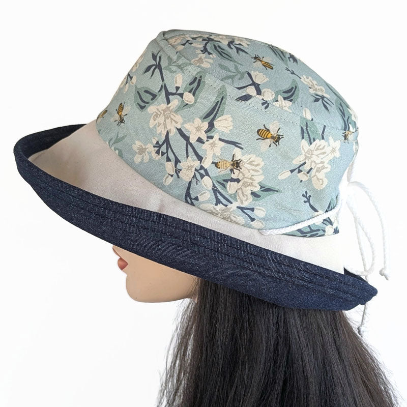 Sunblocker UV sun hat with large wide bucket brim, featuring bees in blues, adjustable fit