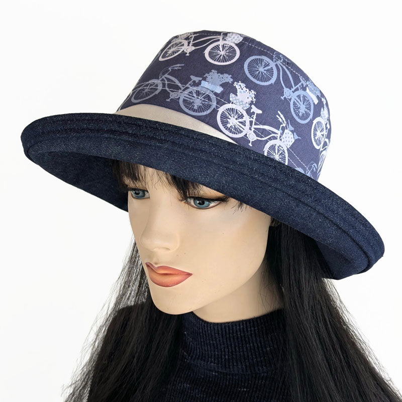Sunblocker UV summer sun hat with wide brim, beautiful bikes in blues, adjustable fit