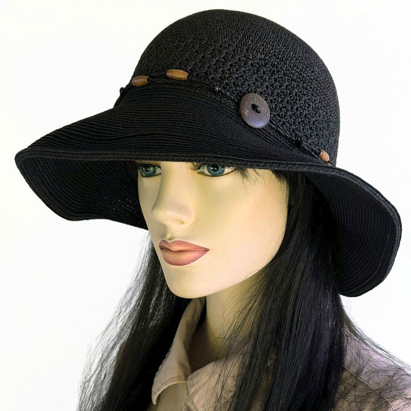 Sold OutSun Hat, Straw Packable black straw hat with button trim and lovely crochet textures, wired brim edge, adjustable fit