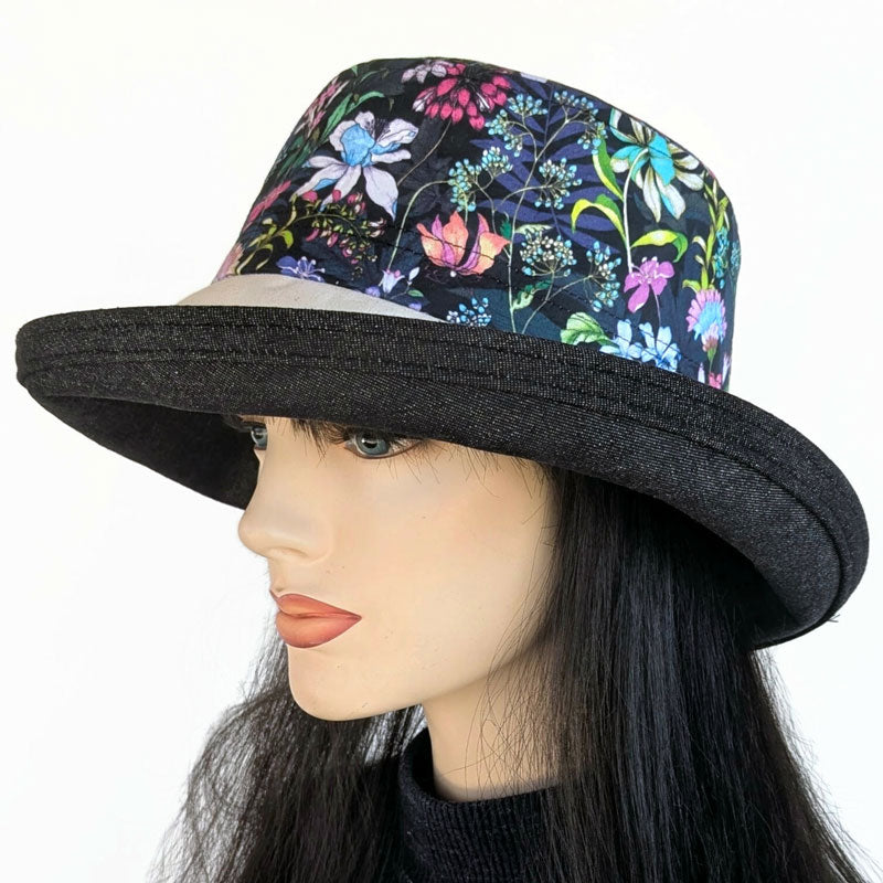 Sunblocker UV summer sun hat with wide brim, featuring pretty flowers on black, adjustable fit