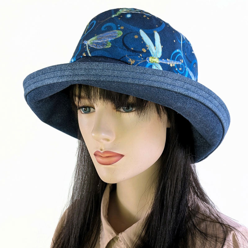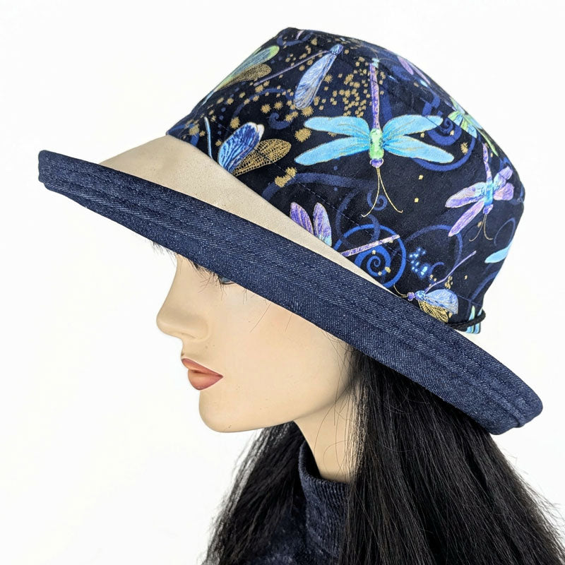 Sunblocker UV summer sun hat with wide brim featuring dragonfly print in navy, adjustable fit