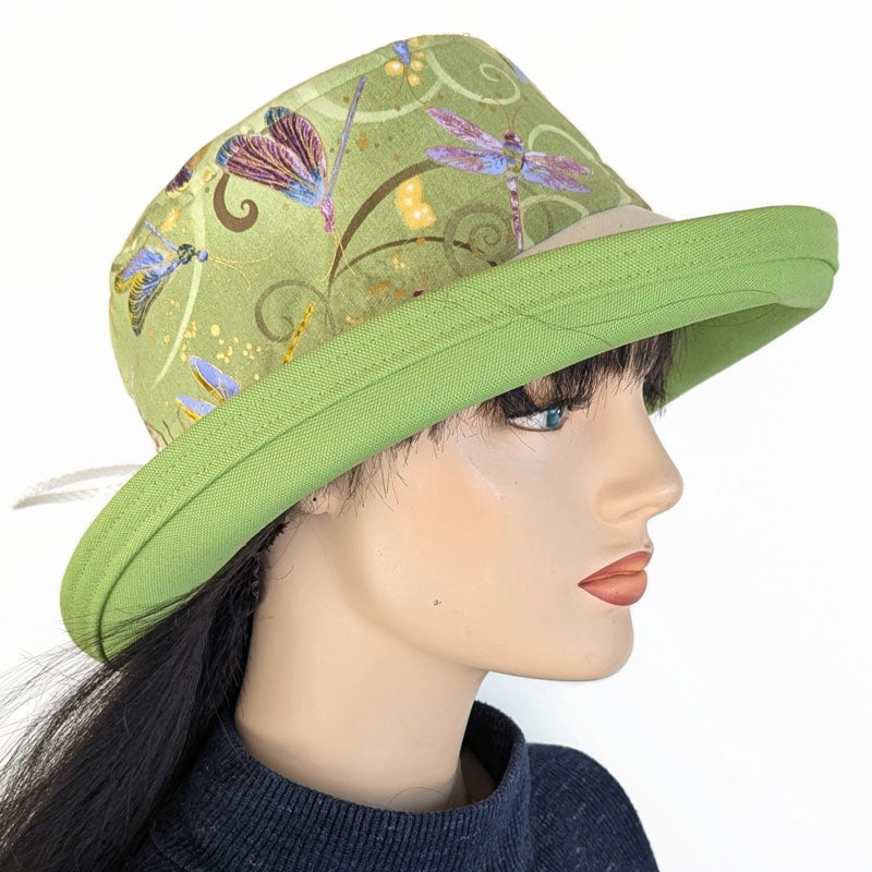 Sunblocker UV summer sun hat with wide brim, gorgeous dragonfly print in green, adjustable fit