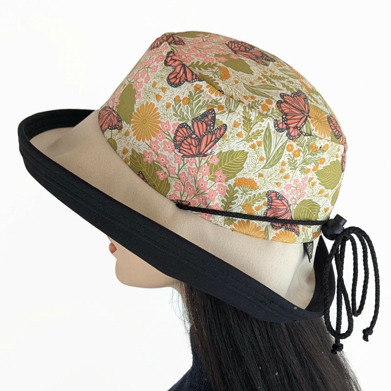 Sunblocker UV summer sun hat with wide brim, monarchs and flowers with gold highlights, adjustable fit