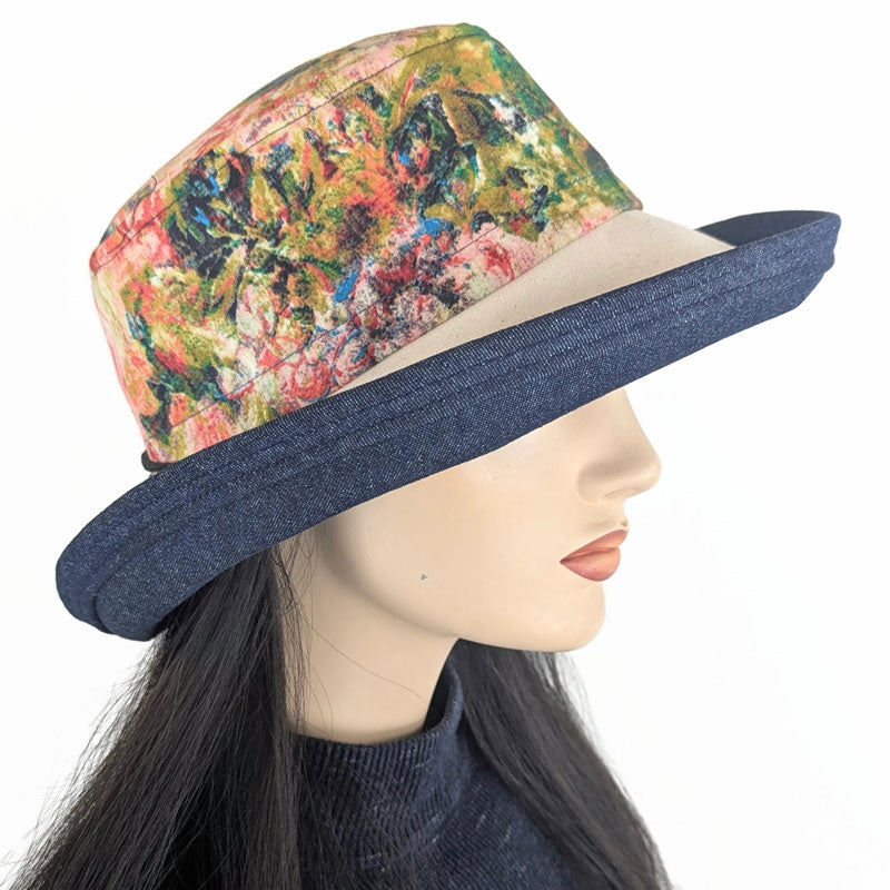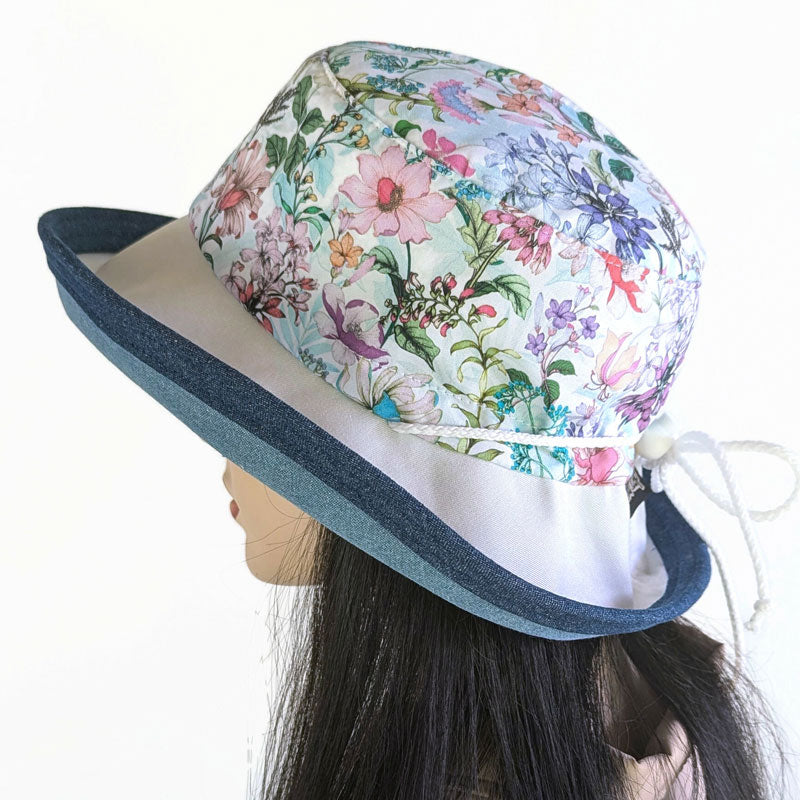 Sunblocker UV summer sun hat with wide brim, canvas floral in blues, adjustable fit