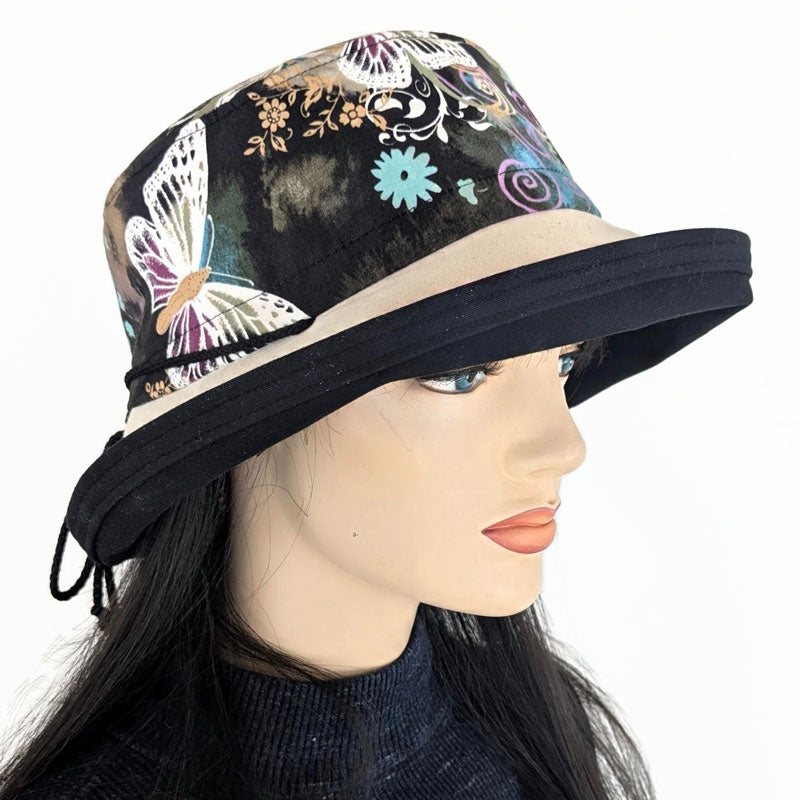 $74.95 CADSunblocker UV summer sun hat with wide brim, pretty butterflies on black, adjustable fit
