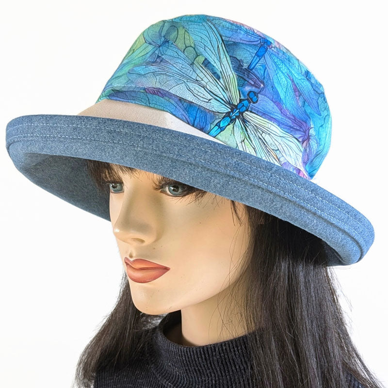 Sold OutSunblocker UV summer sun hat with wide brim, pretty dragonfly print, adjustable fit