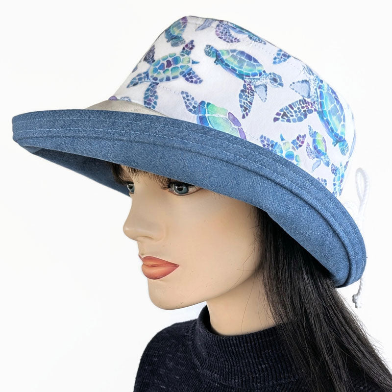 $74.95 CADSunblocker UV summer sun hat with large wide brim, featuring sea turtle print, adjustable fit