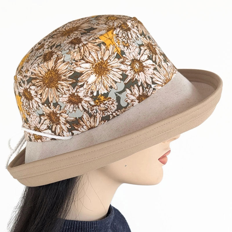 $74.95 CADSunblocker UV summer hat with large wide brim featuring sunflowers print in earth tones, adjustable fit