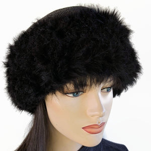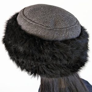 Stylish Faux fur in black frames your face with this beauty. Fur is also inside the hat around the forehead and ears. BLack and grey herringbone woolen fabric finishes the top section of the hat on the top sides and top. This has all the beauty of a rich wide furry headband with the advantage of covering the top of your head with a shaped top to keep your head and hair dry in poor weather. Earflap cuff can be worn inside the hat when indoors or pulled out and down when outside in cold, windy weather. A handsfree hat thanks to the earflap that keeps your hat protecting your ears and head during the worse nasty blustery weather.