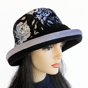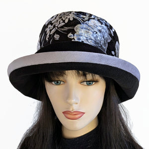 Band features a floral design in beautiful hues of silver while large brim is finished with a stabilizing plastic millinery wire which is covered with silver gray velvet. Hat brim and top is black and both are premium pill and weather resistant polar fleece.