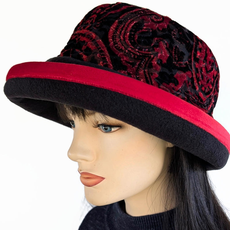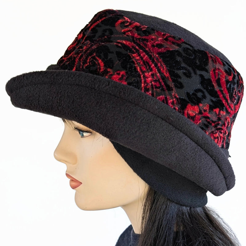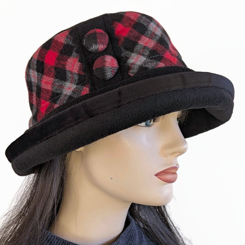 $84.95 CADNiagara Fashion Bucket Hat with earflaps, in black fleece with red and black abstract band and flattering brim