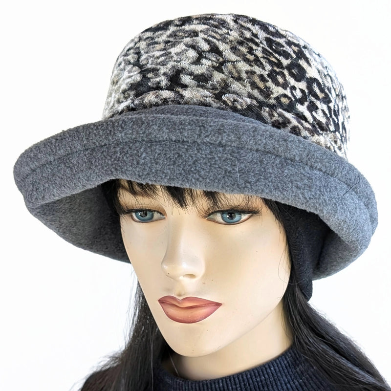 $74.95 CADNiagara Fashion Bucket Hat with earflaps, in charcoal fleece with plush velvet animal print burnout band and flattering brim (Copy)