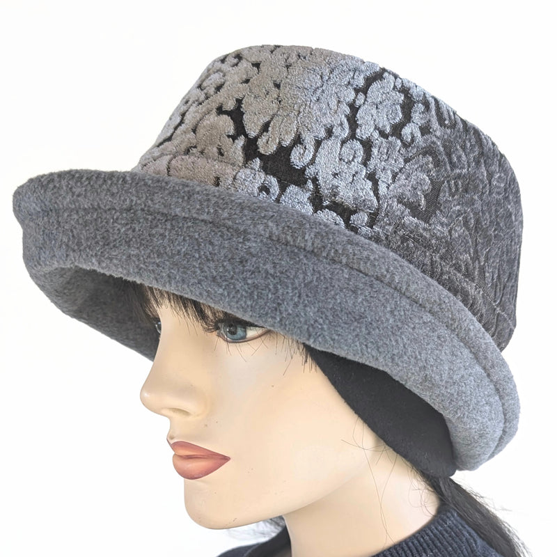 $74.95 CADNiagara Fashion Bucket Hat with earflaps, in charcoal fleece with plush velvet burnout band and flattering brim