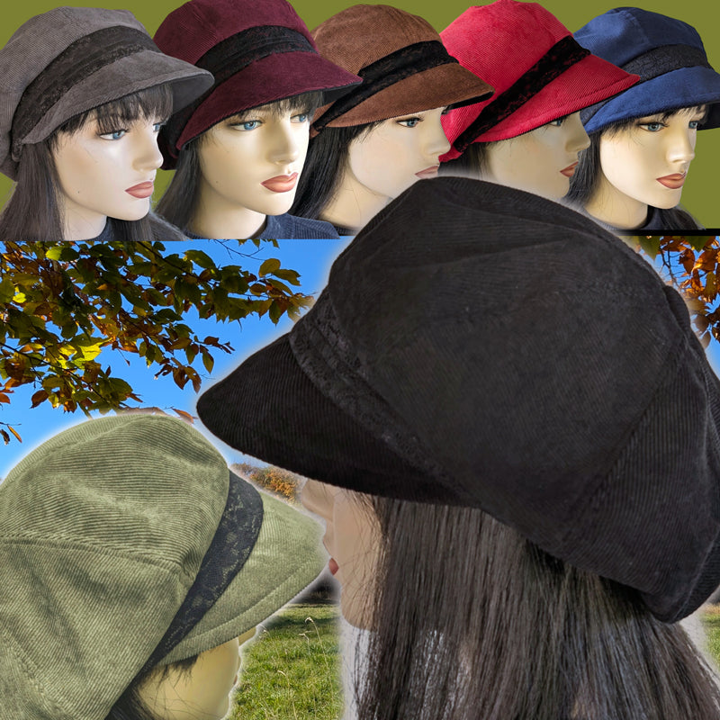 $79.95 CADPoorboy Fashion Cap, relaxed fit, paprika cord or toffee cord with black wool lace trim and faux leather visor