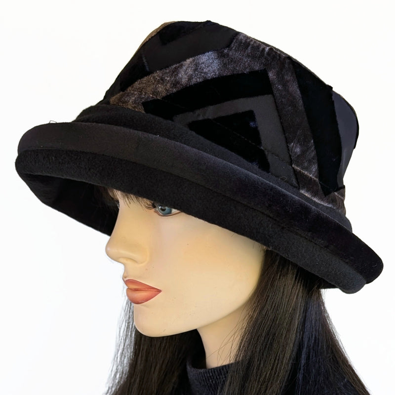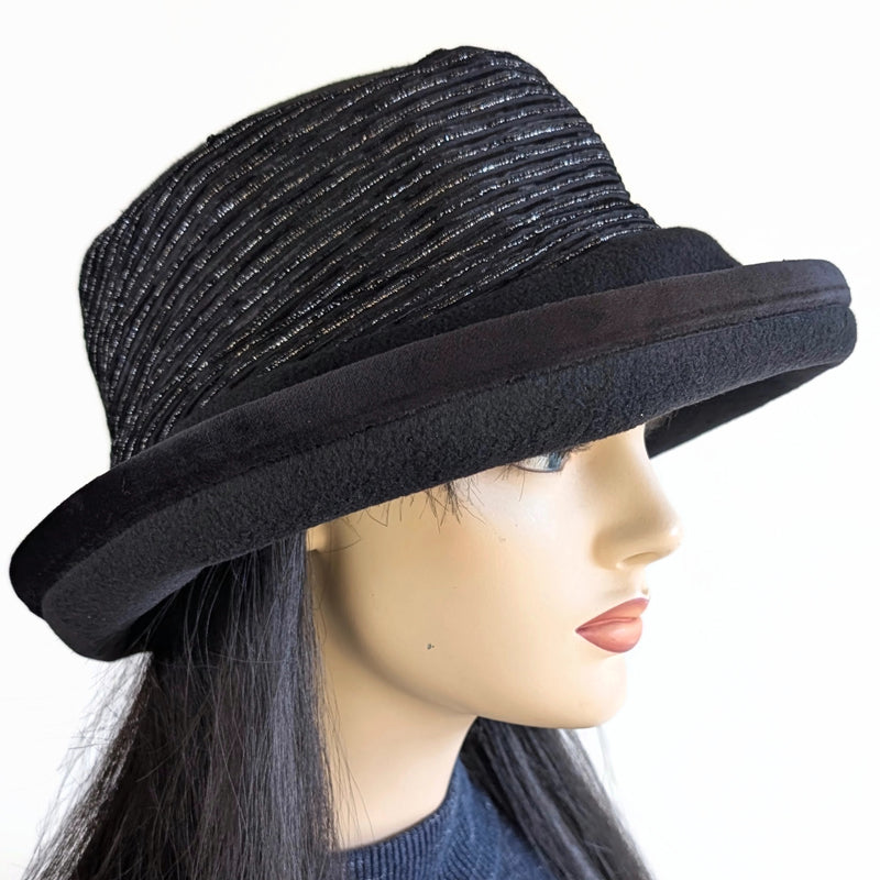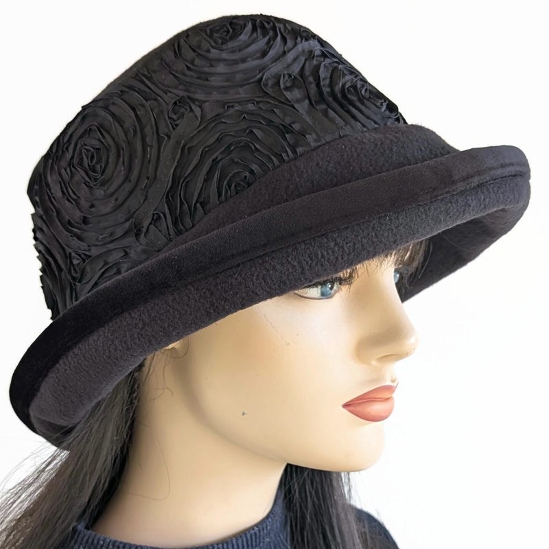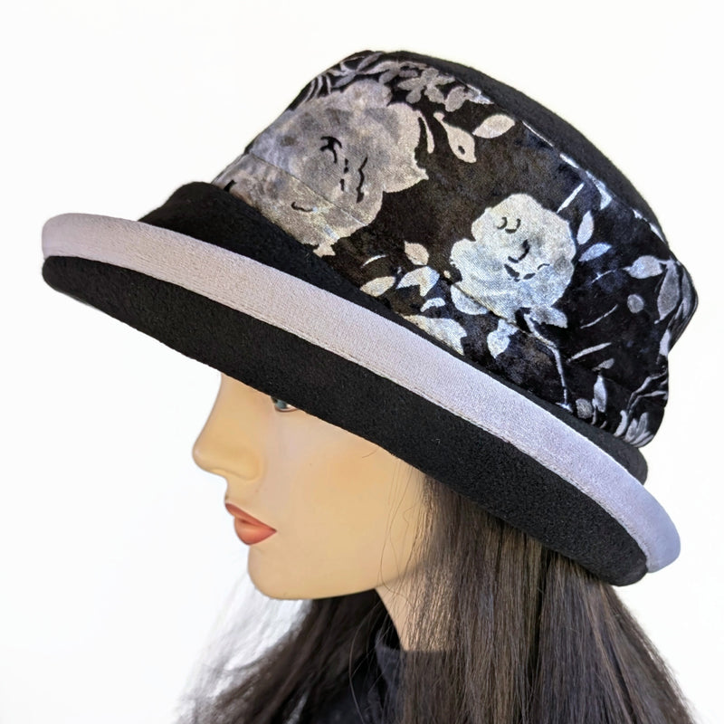 $79.95 CADPremium Winter Fashion Hat in black with gorgeous silver and black floral velvet band, silver velvet trim and wide brim