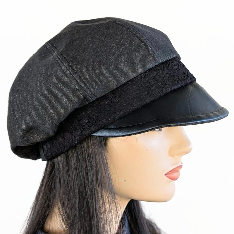 $74.95 CADWashed Denim Poorboy Fashion Cap, relaxed fit, black denim with black lace trim and faux leather visor