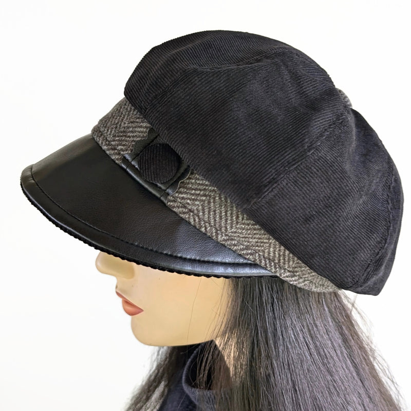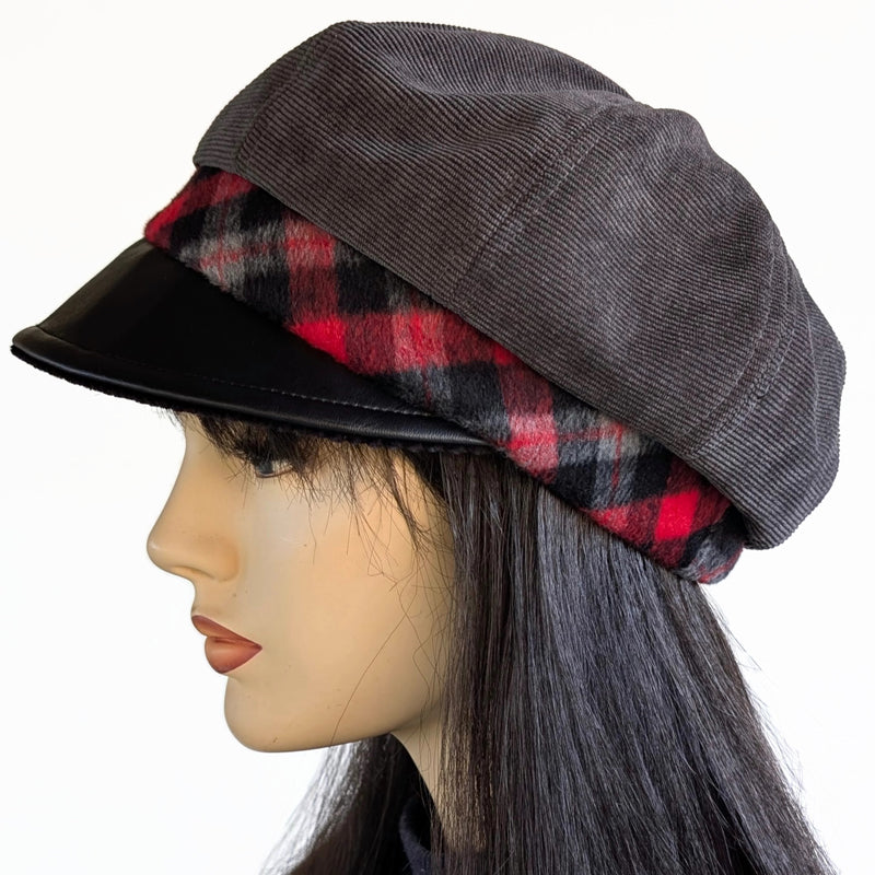 $65.00 CADPoorboy Fashion Cap in charcoal corduroy with black faux leather visor and plaid band