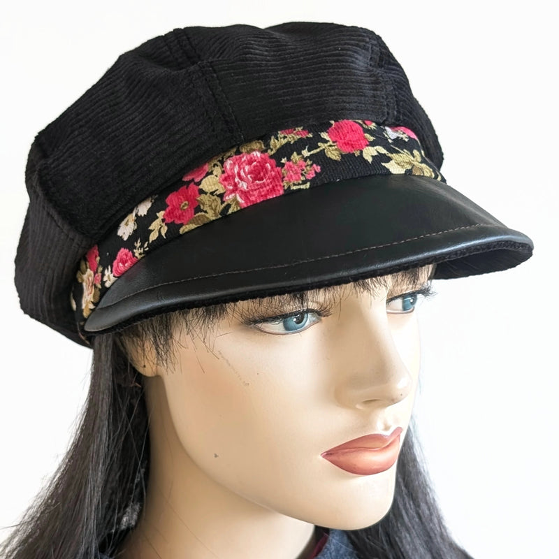 $65.00 CADPoorboy Fashion Cap in black corduroy with black faux leather visor and red rose cord band