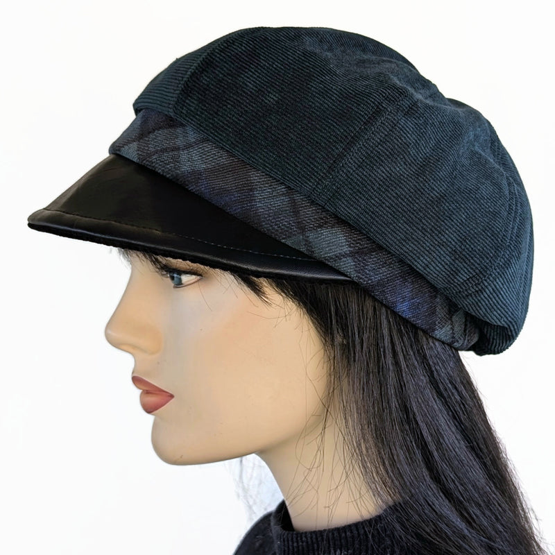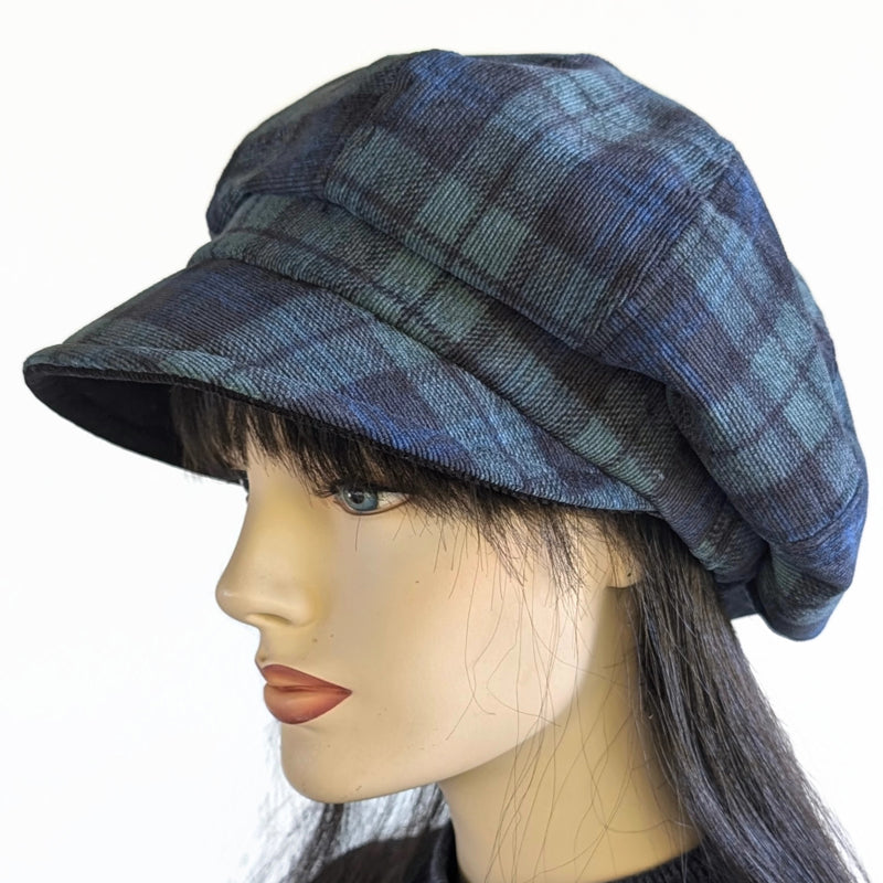 $65.00 CADPoorboy Newsboy Fashion Cap in black watch plaid, beautiful soft corduroy, relaxed fit