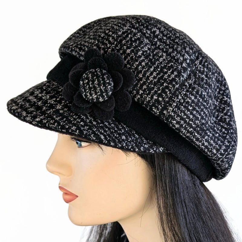 $84.95 CADPoorboy Fashion Cap, relaxed fit, black and charcoal woolen plaid with floral pin