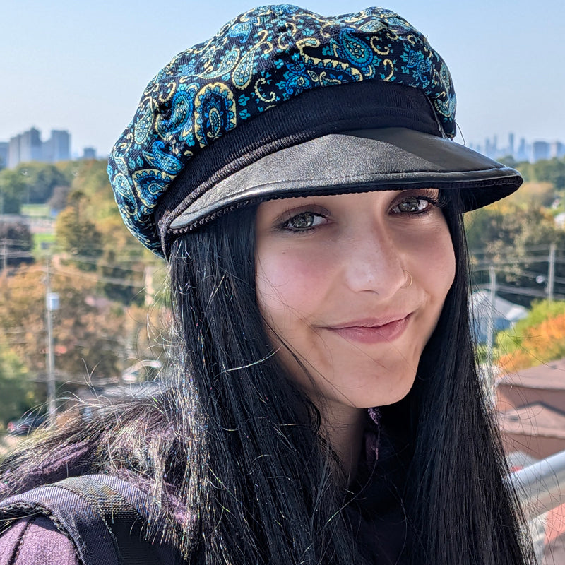 $79.95 CADPoorboy Fashion Cap with black vegan leather trim, blue and yellow paisley, relaxed fit