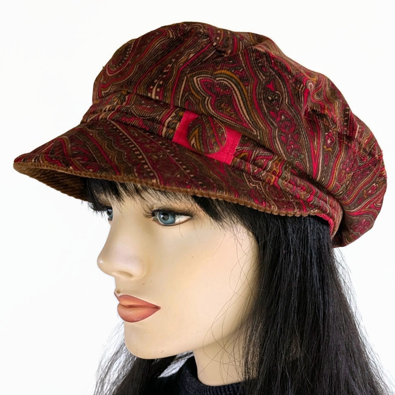$65.00 CADFisherman Fashion Cap in fine corduroy, relaxed fit, brown and red paisley