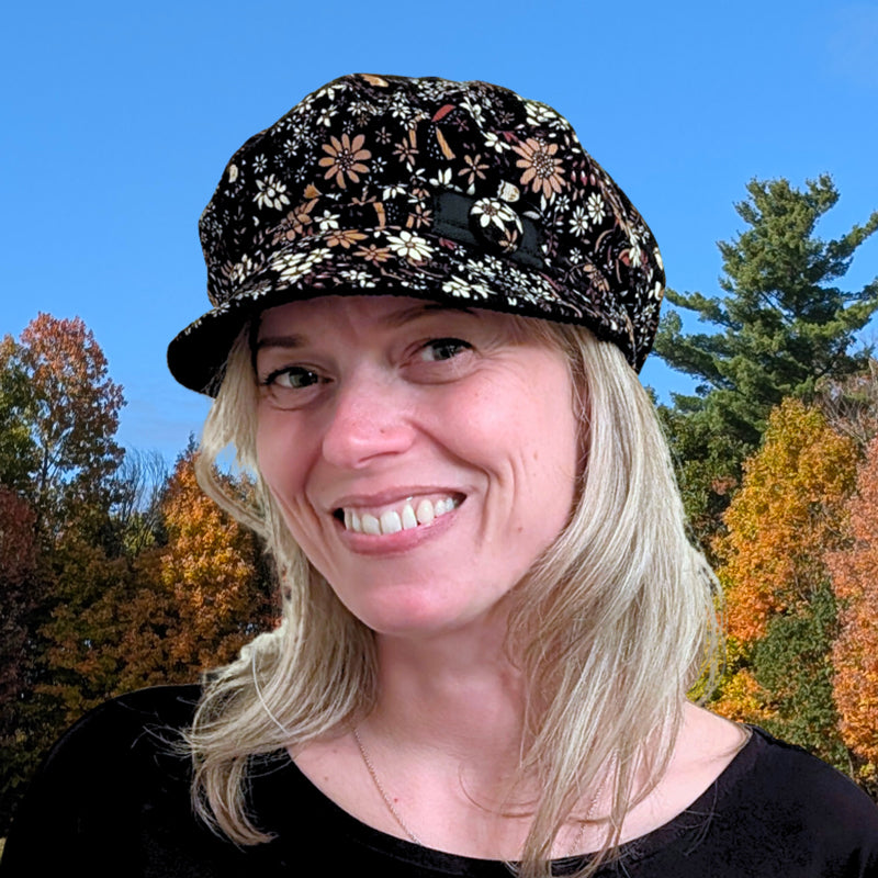 $65.00 CADFisherman Fashion Cap in fine corduroy, relaxed fit, floral in browns, cream on black