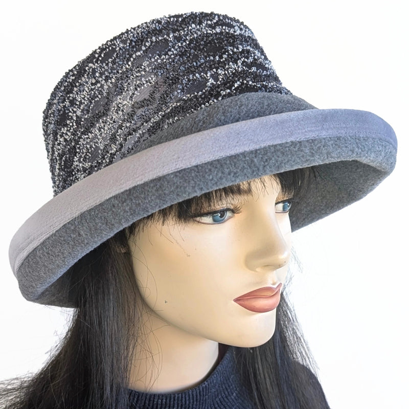 $65.00 CADPremium Winter Fashion Hat in charcoal, with textured boucle band, silver velvet edge trim and wide brim