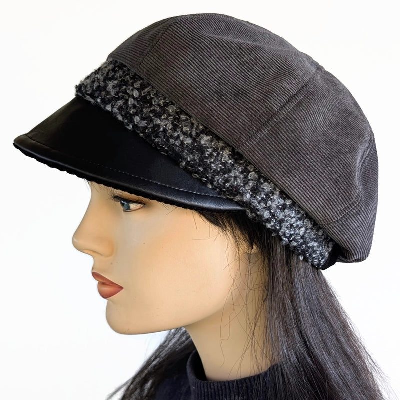 $65.00 CADPoorboy Fashion Cap, regular fit, in charcoal corduroy with black faux leather visor and fuzzy boucle band