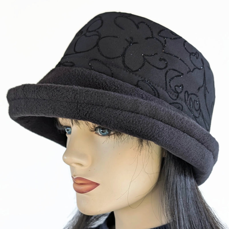 $74.95 CADNiagara Fashion Bucket Hat with earflaps, in black fleece with sparkly black abstract band and flattering brim