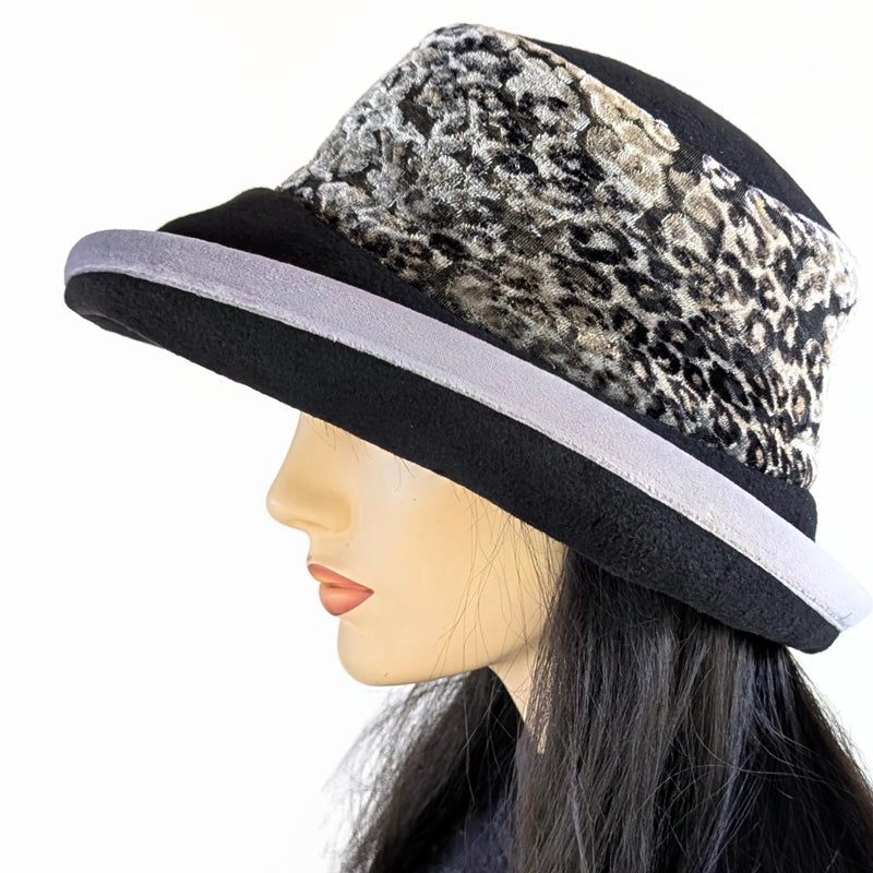 $79.95 CADPremium Winter Fashion Hat with earflaps, in black with gorgeous silver and black animal print velvet band, silver velvet trim and wide brim