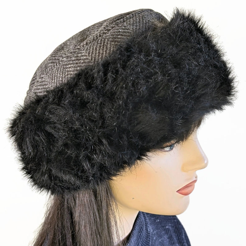 $79.95 CADFaux Fur and Fleece Fashion Pillbox Beanie Toque Hat, black and charcoal herringbone, with earflaps