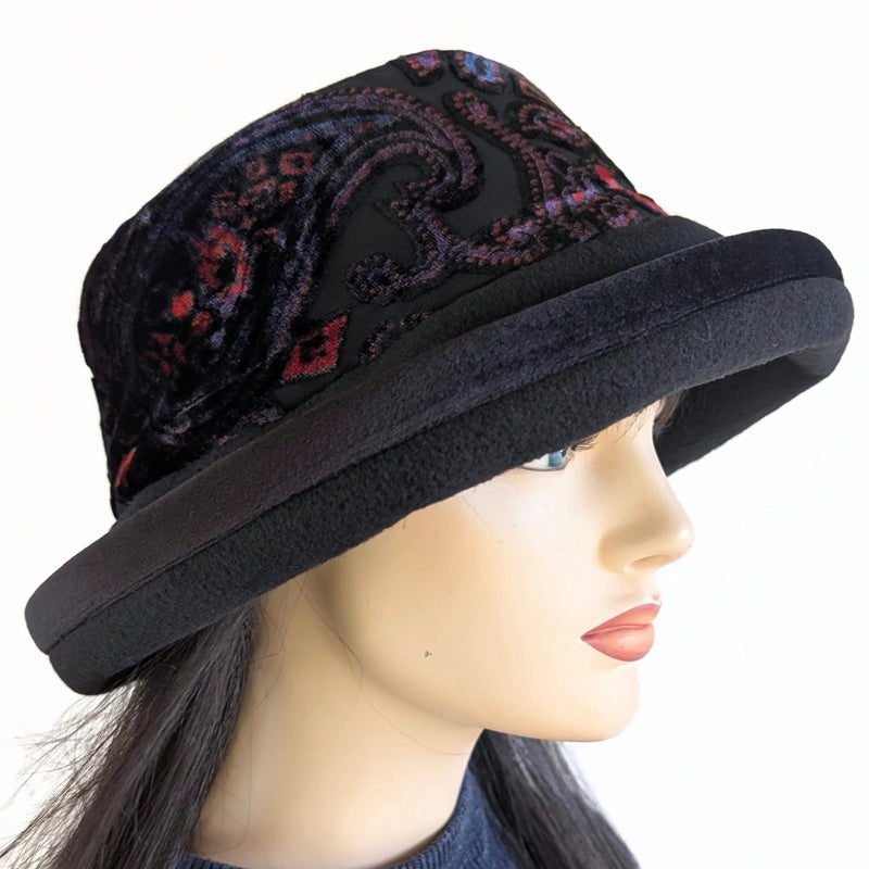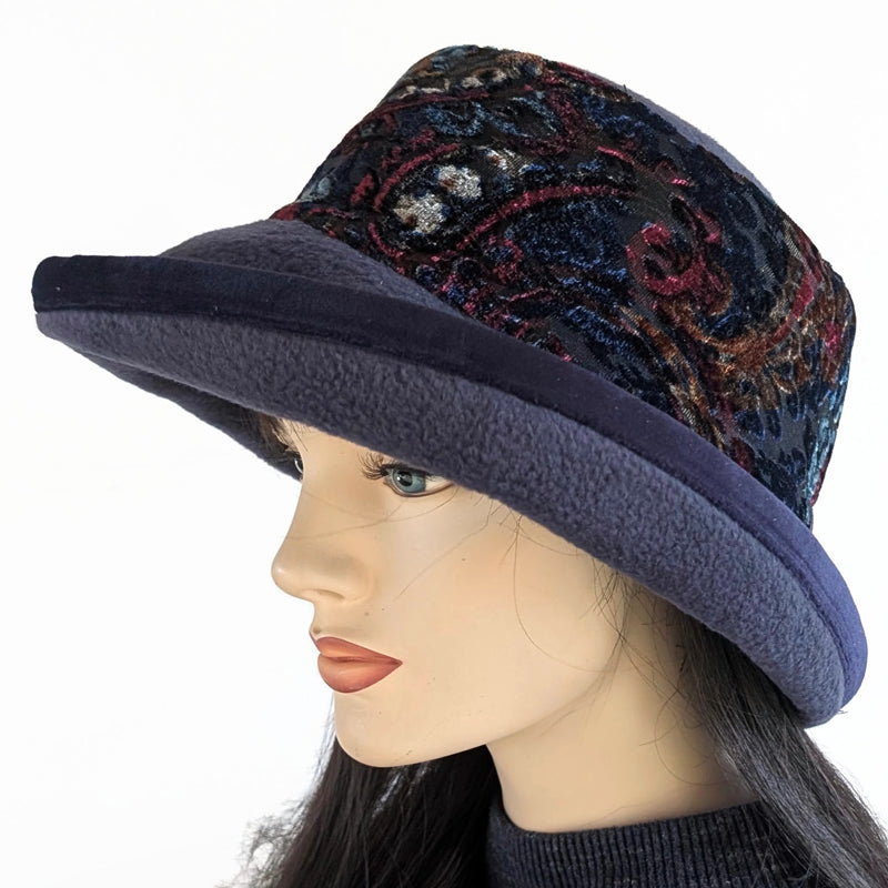 from $79.95 CADPremium Winter Fashion Hat in navy, with navy based paisley plush velvet band, navy velvet edge trim and wide brim