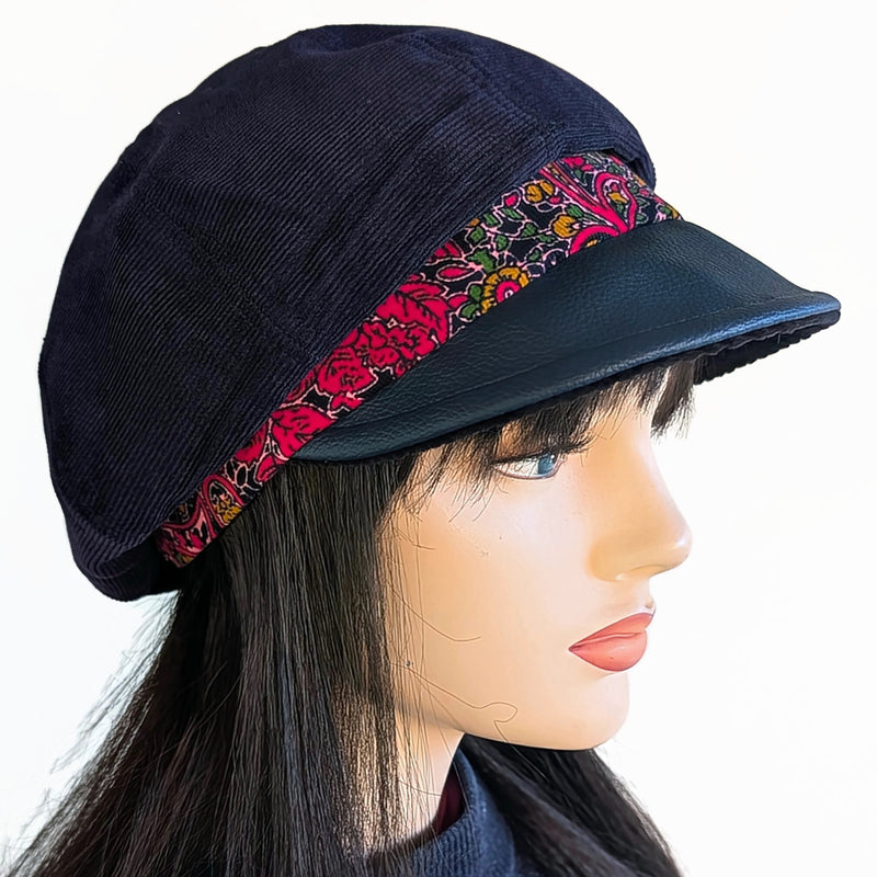 $69.95 CADPoorboy Fashion Cap, baggy fit, navy corduroy with navy faux leather visor and red rose pretty band