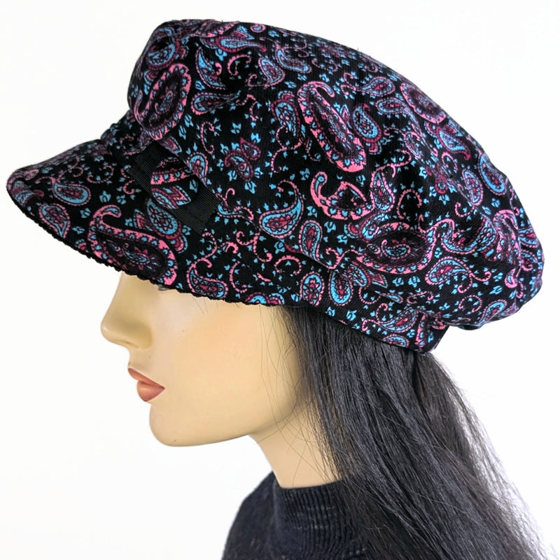 $65.00 CADFisherman Fashion Cap in fine corduroy, relaxed fit, pink and blue paisley on black