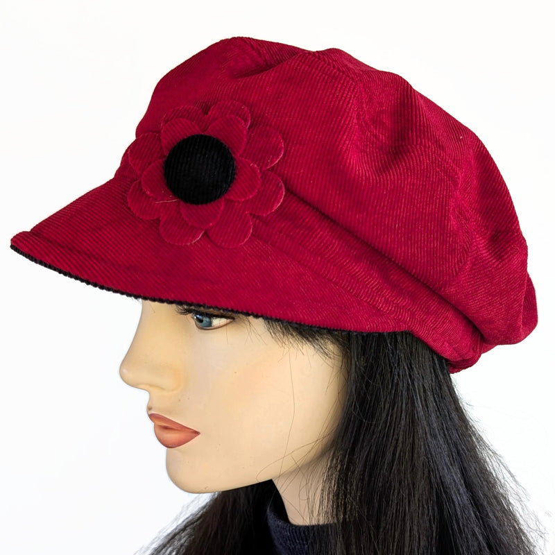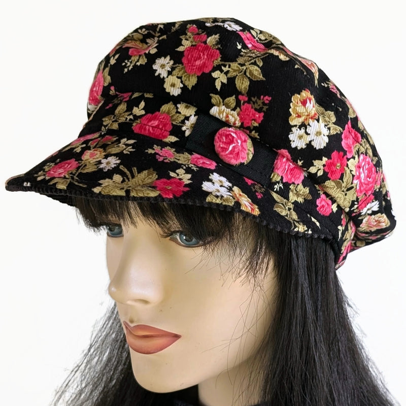 $65.00 CADFisherman Fashion Cap in fine corduroy, relaxed fit, cabbage roses in pinks and reds