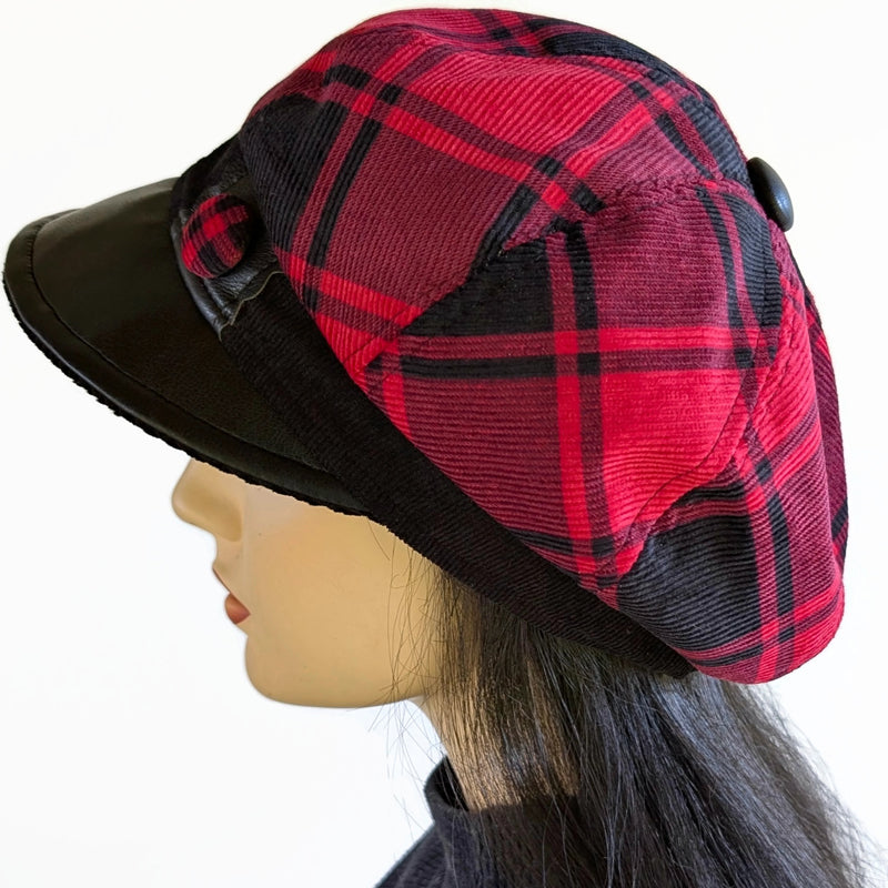 $65.00 CADPoorboy Fashion Cap with black vegan leather trim, red and black plaid cord, relaxed fit