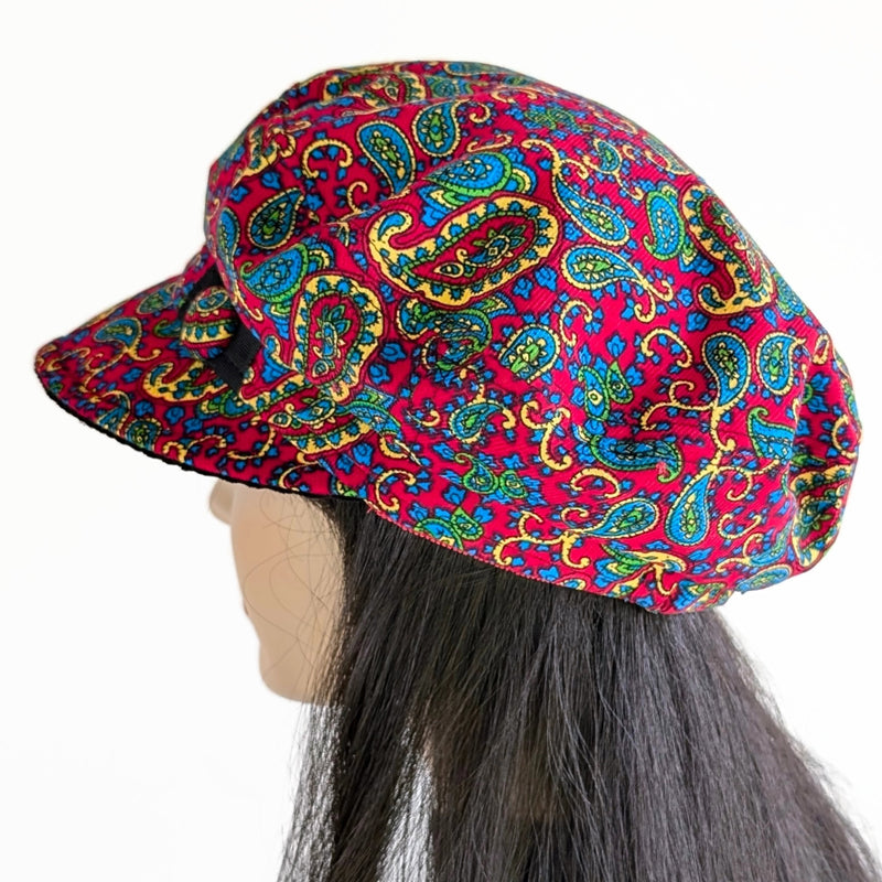 $65.00 CADFisherman Fashion Cap in fine corduroy, relaxed fit, red and royal paisley