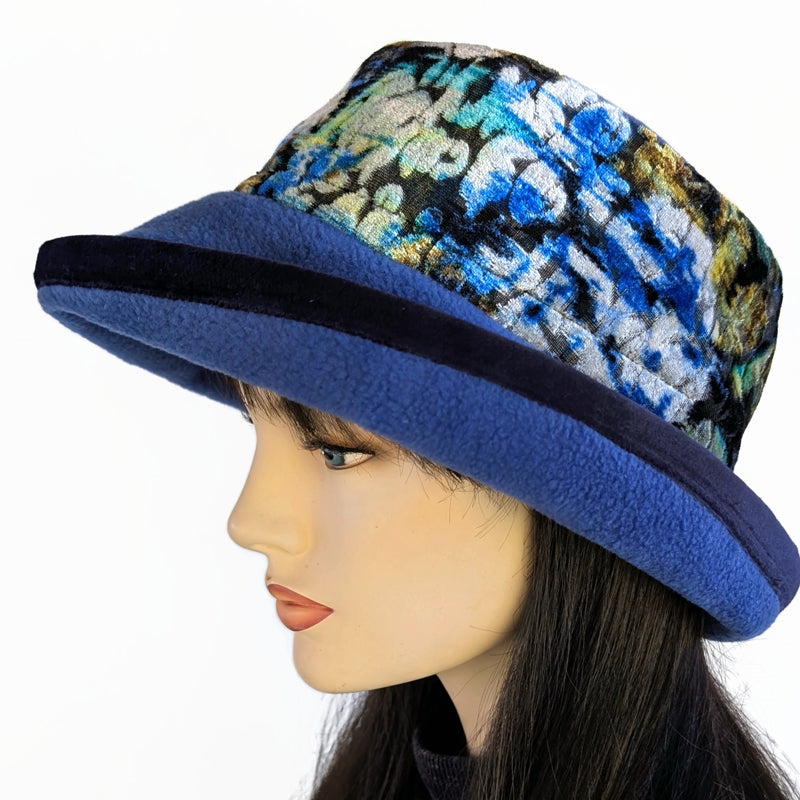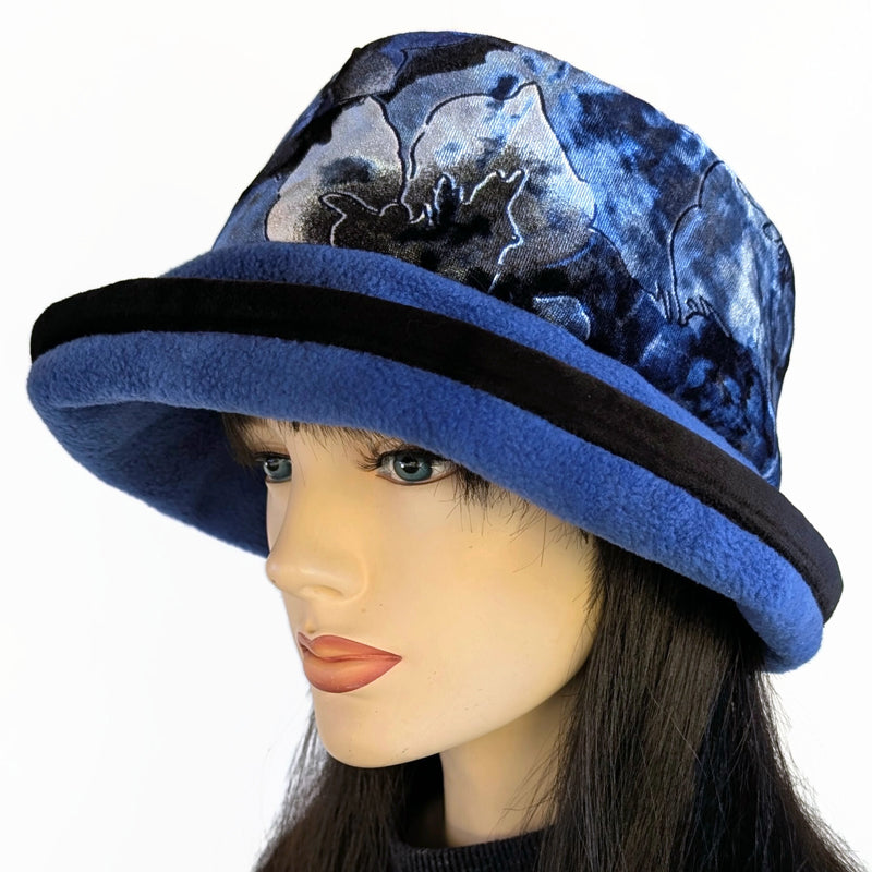 $79.95 CADPremium Winter Fashion Hat in royal with gorgeous silver and blue floral band, velvet trim and wide brim