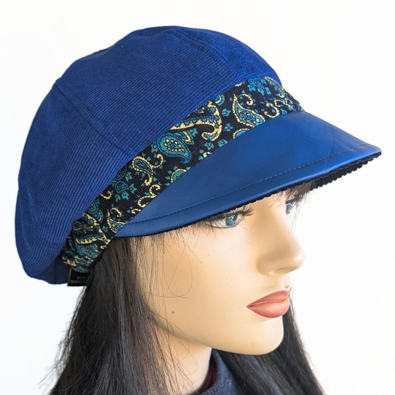 $65.00 CADPoorboy Fashion Cap in royal blue corduroy with royal faux leather visor and paisley print trim