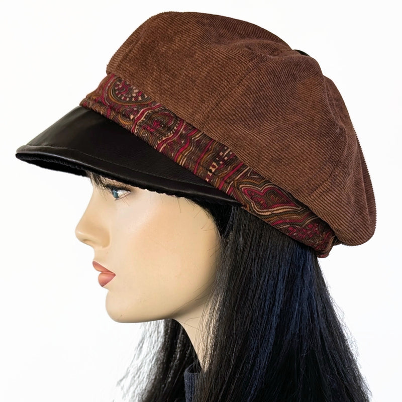 $65.00 CADPoorboy Fashion Cap in toffee corduroy with brown faux leather visor and paisley cord print