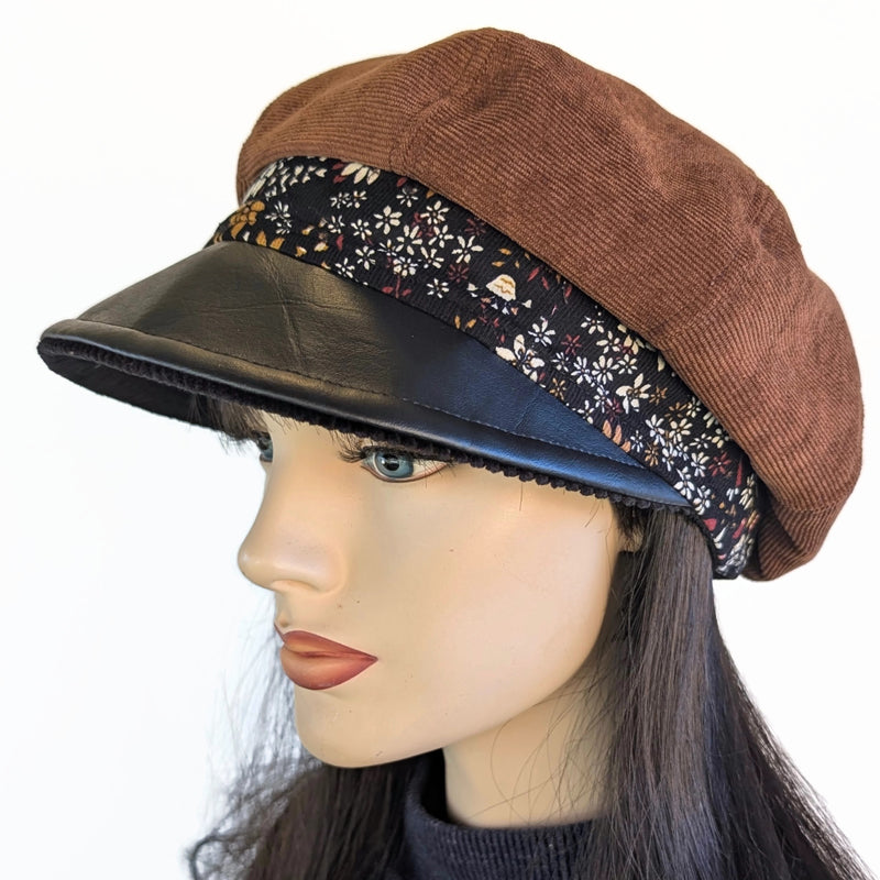 $65.00 CADPoorboy Fashion Cap in toffee corduroy with black faux leather visor and floral print