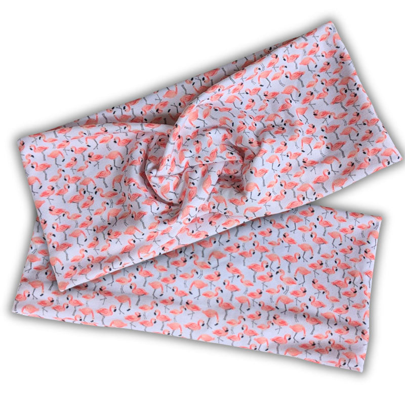 Premium, wide turban style comfy wide jersey knit headband, small flamingos on white