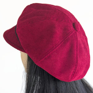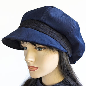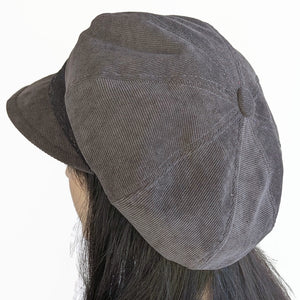 Poorboy/Newsboy Fashion Cap in 16 wale cord for the cooler weather ahead trimmed with button top and lace trim in band panel. Eight panel top has a touch of beret with the bonus of a protective broad visor brim. This one is trimmed with a band overlay of black lace trim. Assorted colors available.