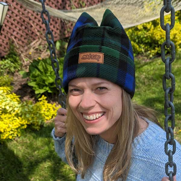 Fleece Fashion Cap with floral pin in popular plaid check, with fleece cuff and pin