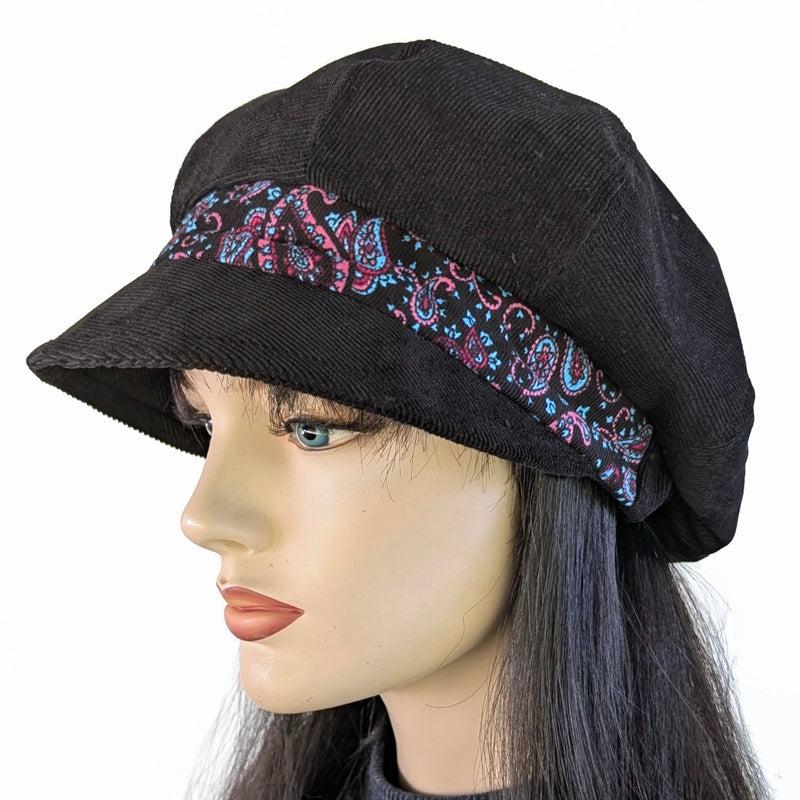$65.00 CADNewsboy Fashion Cap, baggy fit, in black cord with black with fun paisley print band